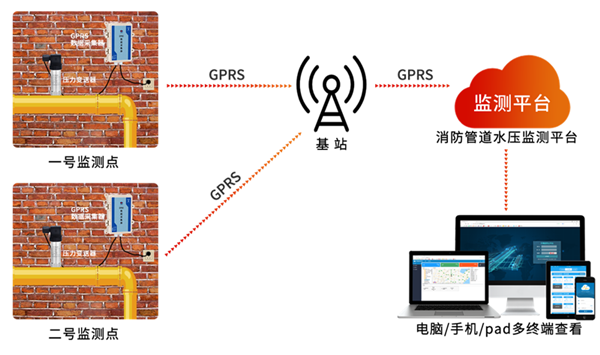 目前消防系統管道水壓無法實時監測,消防部門很難對消防水壓進行有效監控,導致部分消防系統長期處于水壓不足甚至沒有水壓的狀態?;馂囊坏┌l生,消防系統無法及時連接,消防隱患十分嚴重,無疑會給人民群眾的生命財產帶來極大的危害。而在實際情況下,一旦消防管道水壓出現異常,人工發現后,檢查人員通知消防人員到現場搶修,整個過程相對較長,部分消防管道水壓異常無法及時發現,檢查人員不易了解異常原因,延誤了異常的處理時間。