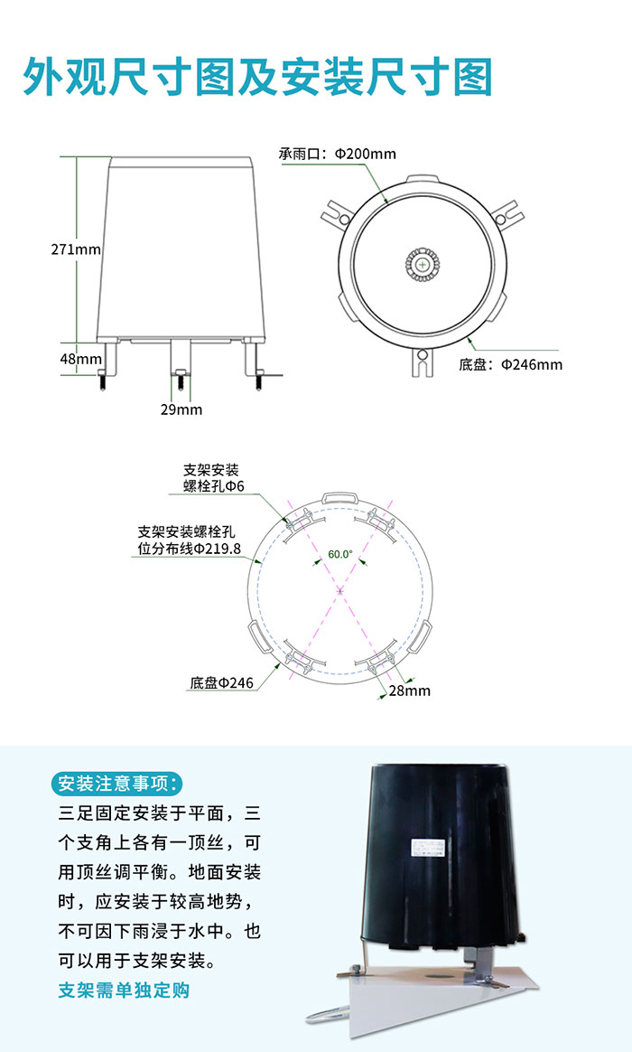 RS-YL-PL-2型翻斗式雨量傳感器是一種水文、氣象儀器,用于測量自然界降雨量,同時將降雨量轉換為以開關量形式表示的數字信息量輸出,以滿足信息傳輸、處理、記錄和顯示等的需要。由承雨器部件和計量部件等組成。承雨口口徑Φ200mm。計量組件是一個翻斗式機械雙穩態秤重機構,其功能是將以mm計的降雨深度轉換為開關信號輸出。專利防蟲網,防堵水口設計,內置水平儀,雙干簧管。其性能符合國家標準GB/T 21978.2-2014《降水量觀測要求》要求。
